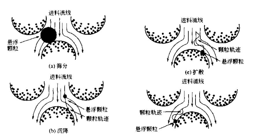 所有澄清過濾技術(shù)至少涉及一種下面所列出的機(jī)理篩分,沉降,截留,慣性碰撞,擴(kuò)散,流體動力學(xué)相互作用,靜電相互作用,雙電層排斥作用,范德華力.