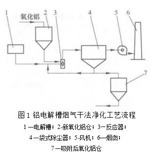 其煙氣干法凈化工藝流程:各電解槽的煙氣匯集在一起進入反應(yīng)器,同時定量加入新鮮氧化鋁,然后進入袋式除塵器.