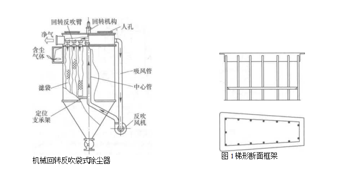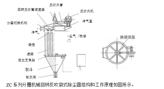 反吹風(fēng)清灰裝置:包括回轉(zhuǎn)反吹臂,反吹口,分圈切換機構(gòu),循環(huán)風(fēng)管,反吹風(fēng)管,反吹風(fēng)機,減速器.