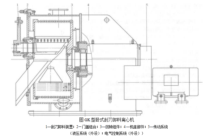 GK型臥式刮刀卸料離心機主要由刮刀機構(gòu),門蓋組件,轉(zhuǎn)鼓組件,機座組件,傳動系統(tǒng),液壓系統(tǒng)及電氣控制系統(tǒng)等部件組成.