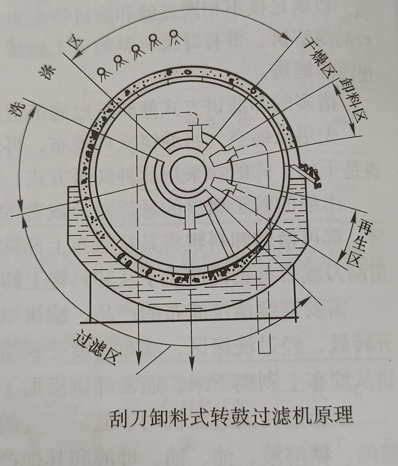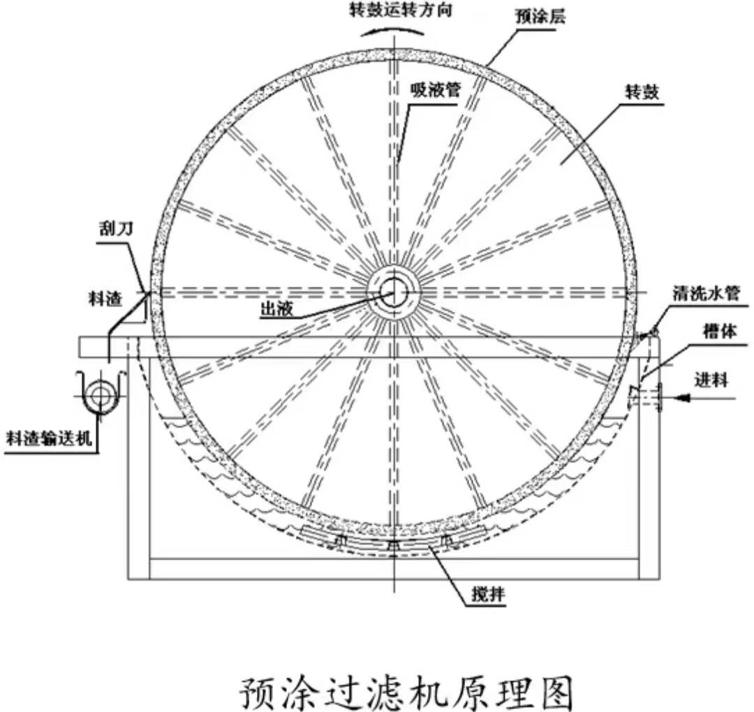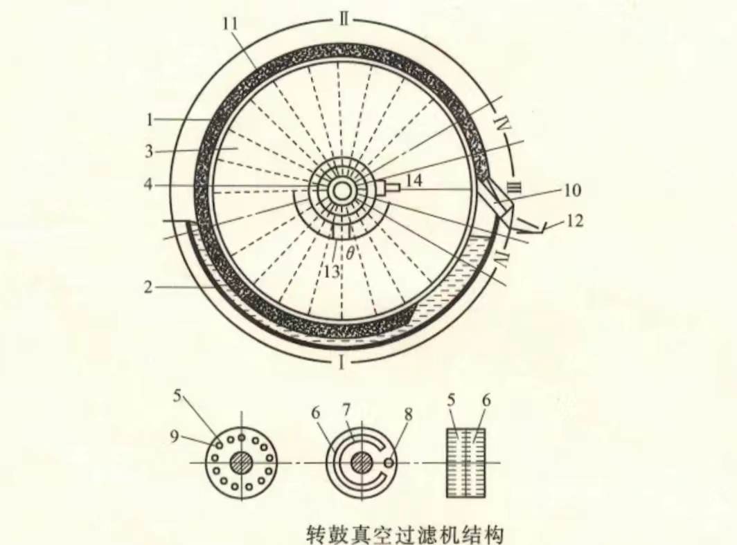 刮刀卸料式轉(zhuǎn)鼓真空過濾機(jī)的主要部件包括水平放置的轉(zhuǎn)鼓,料漿槽,攪拌器,分配頭也稱為,切換閥,轉(zhuǎn)皺的表面,圓周面,鑲有若干塊長(zhǎng)方形的篩板,在篩板上順次鋪有金屬網(wǎng)和濾布.