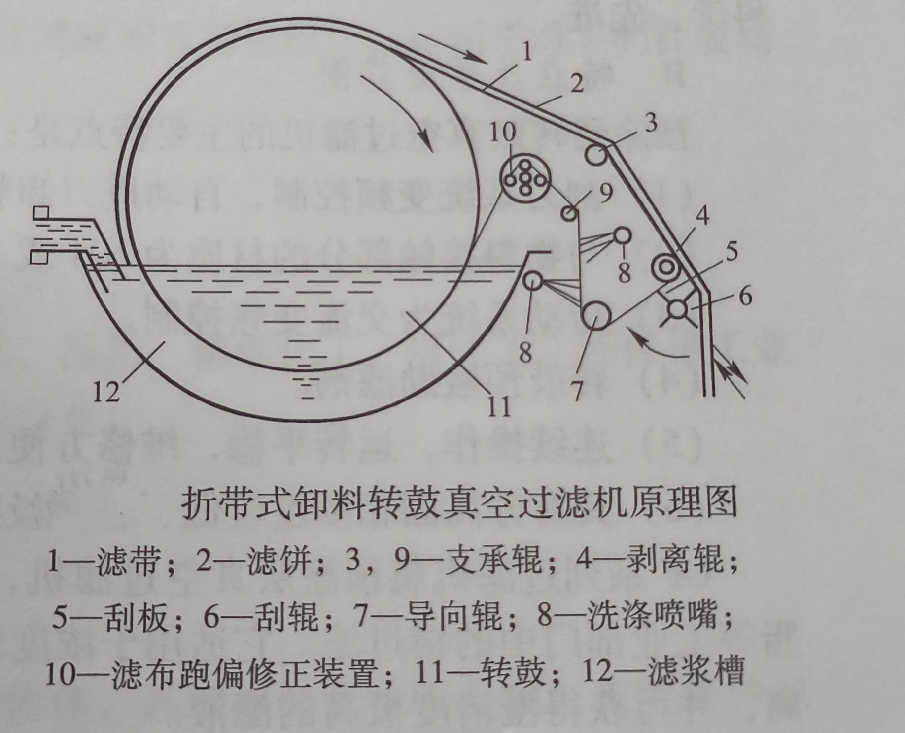 帶在轉(zhuǎn)鼓的帶動(dòng)下一起循環(huán)轉(zhuǎn)動(dòng),因而在轉(zhuǎn)動(dòng)過程中,有時(shí)和轉(zhuǎn)鼓接觸,有時(shí)則離開轉(zhuǎn)鼓面.濾帶由卸料輥及導(dǎo)向輥支承,并設(shè)有防止濾布跑偏的裝置.