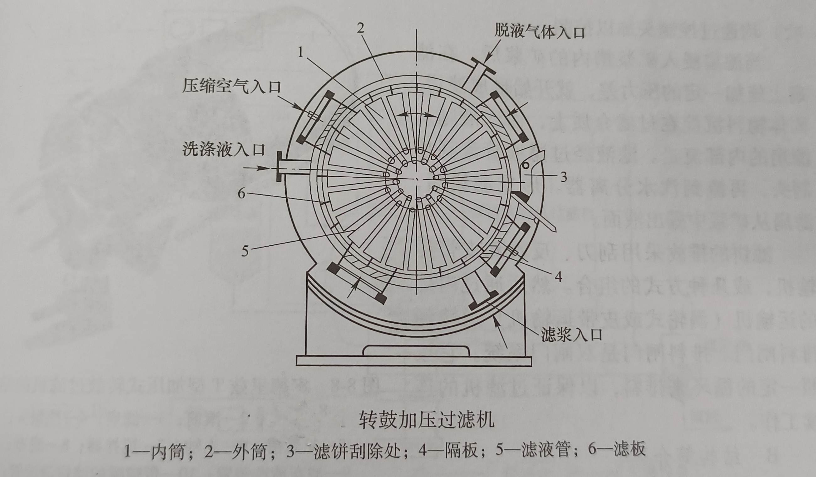 多室型加壓式轉(zhuǎn)鼓過濾機(jī)具有雙層圓筒,即固定不動(dòng)的外簡(jiǎn)和連續(xù)旋轉(zhuǎn)的內(nèi)筒,內(nèi)外筒之間形成的空間由隔板分隔為過濾,洗滌,干燥,卸料及濾布洗滌等區(qū)間.改變隔板位置可改變各區(qū)間所占比率.