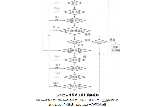 (2) “進(jìn)料一振打卸料”全自動(dòng)。1XZK打到自動(dòng)位置,2XZK打到卸料位置,3XZK 視需要循環(huán)是否打到要求位置,按下自動(dòng)啟動(dòng)按鈕ZQA,壓濾機(jī)即按程序連續(xù)運(yùn)行。直到 3XZK由循環(huán)打到結(jié)束位。