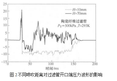Berbner[ 39]等人通過測定陶瓷纖維 過濾管上部位置的內外壓力波形,認芝為噴吹距離(脈沖反吹噴嘴與過濾管開口端面之間的距離)對壓力波形的振蕩和負壓區(qū)域有重要影響。如圖2所示,當噴吹距離過小時,過濾管內開口端位置負壓持續(xù)時間顯著增加Grannell[40]等在由單根陶瓷纖維過濾“ 管組成的實驗裝置上,分析了噴吹距離和引射器結構形式對濾管內外壓力置附近不產(chǎn)生負壓引起過濾管外氣體抽吸到內部為判斷準則,確定最佳噴吹距離。