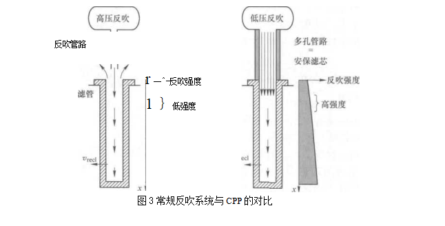當安裝失效保護濾芯時會削弱脈沖氣流強度,尤其在過濾細粉或黏性粉塵時,脈沖反吹系統(tǒng)可能會存在問題。顆粒會堵塞,引起壓降增加。Pall公司設計了一種新型的壓力脈沖集成裝置S' (Couple pressure pulse, CPP),該方法將脈沖反吹系統(tǒng)與過濾管耦合在一起。其特點是噴吹壓力僅高于系統(tǒng)操作壓力0.05~0. IMPa,而常規(guī)的脈沖反吹壓力一般。需要操作壓力的2倍左右。圖3為常規(guī)脈沖反吹系統(tǒng)與CPP的結構對比示意圖,